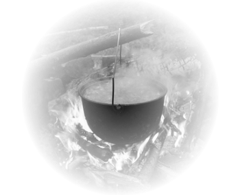 Teilnehmer in die Kunst des Feuermachens eingewiesen, um einen Eintopf ueber dem offenen Feuer